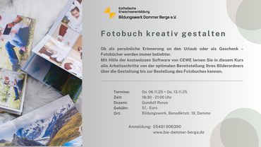 An zwei Abenden erlernen Sie die Grundlagen der kreativen Gestaltung eines Fotobuches. Es wird in diesem Kurs mit der kostenlosen CEWE-Software gearbeitet.
